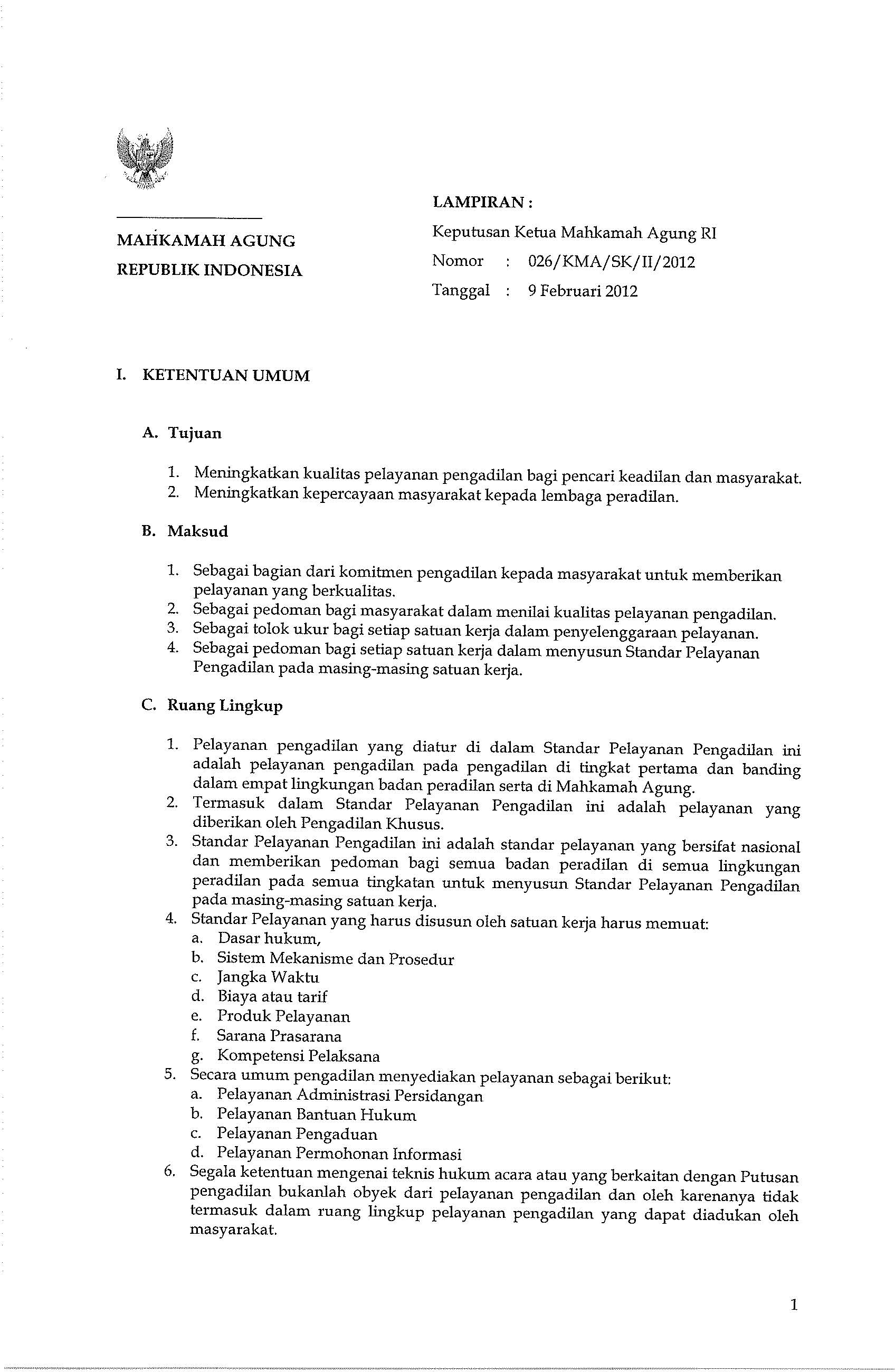 Dasar Hukum dan Standar Pelayanan pada Badan Peradilan Umum Mahkamah Agung Republik Indonesia tercantum dalam Lampiran Surat Keputusan KMA No. 026 / KMA / SK / II / 2012 yang dapat diunduh pada tautan berikut.
